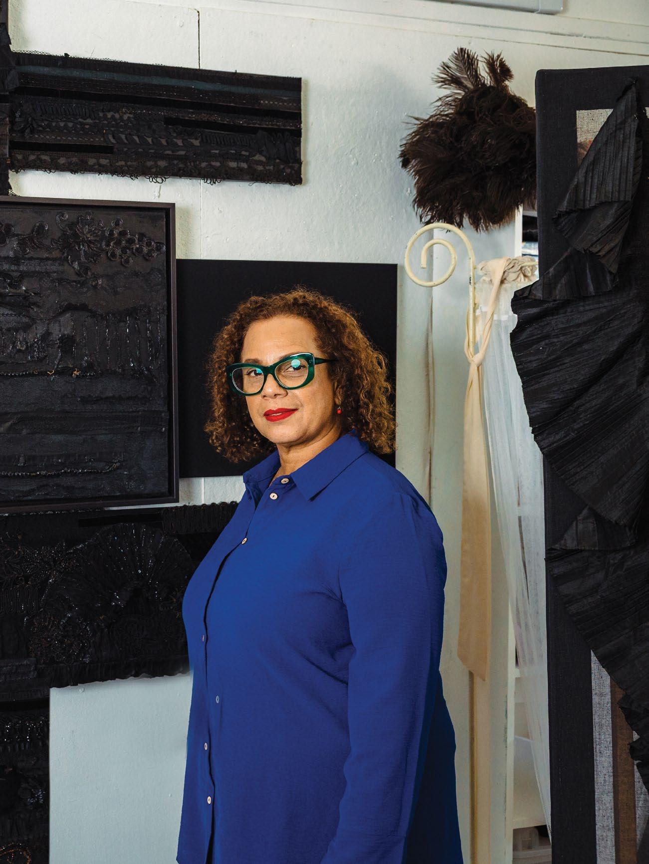 In the past few years, Cynthia has built a new arm of her work, focused on black textiles. She aimed to push back on the obvious connotations of the color black, associated with darkness and mourning. To contrast those feelings, she adds flecks of mica, beads, and sequins to allude to a sense of whimsy and magic. She is currently creating a large black textile painting that will include at least a dozen panels. The use of black was inspired by dark matter and black holes that catalyzed the beginning of the universe, but they are also metaphors for the Black experience. “In my lifetime, I was not born into slavery. But as a Black person, I feel the gravitational pull of that,” she explained.