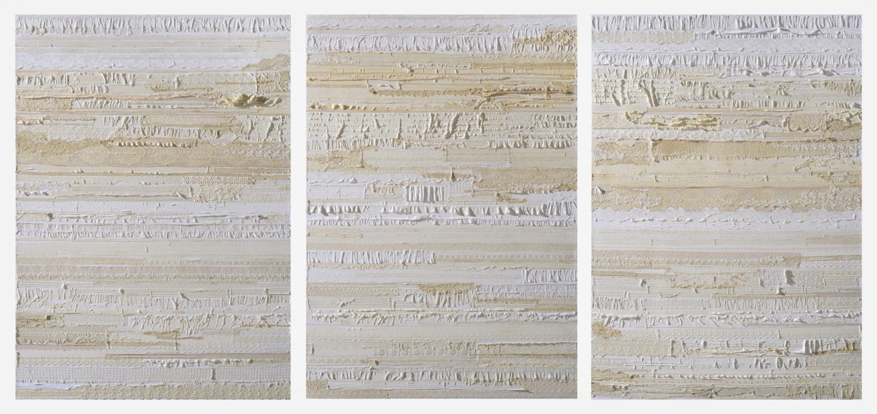 One of her most important works, Continents, is a large three-panel textile painting consisting of off-white strips of linen, cotton, and lace that depicts themes of genomics and geology.“ These patterns represent sediment or histories, landscapes, and various patterns crossing from one panel to the next, like DNA traits passing from one ancestor to another,” she said. Her work also incorporates vintage and recycled textiles, such as blouses from the 1920s, which play into intergenerational themes in her paintings.