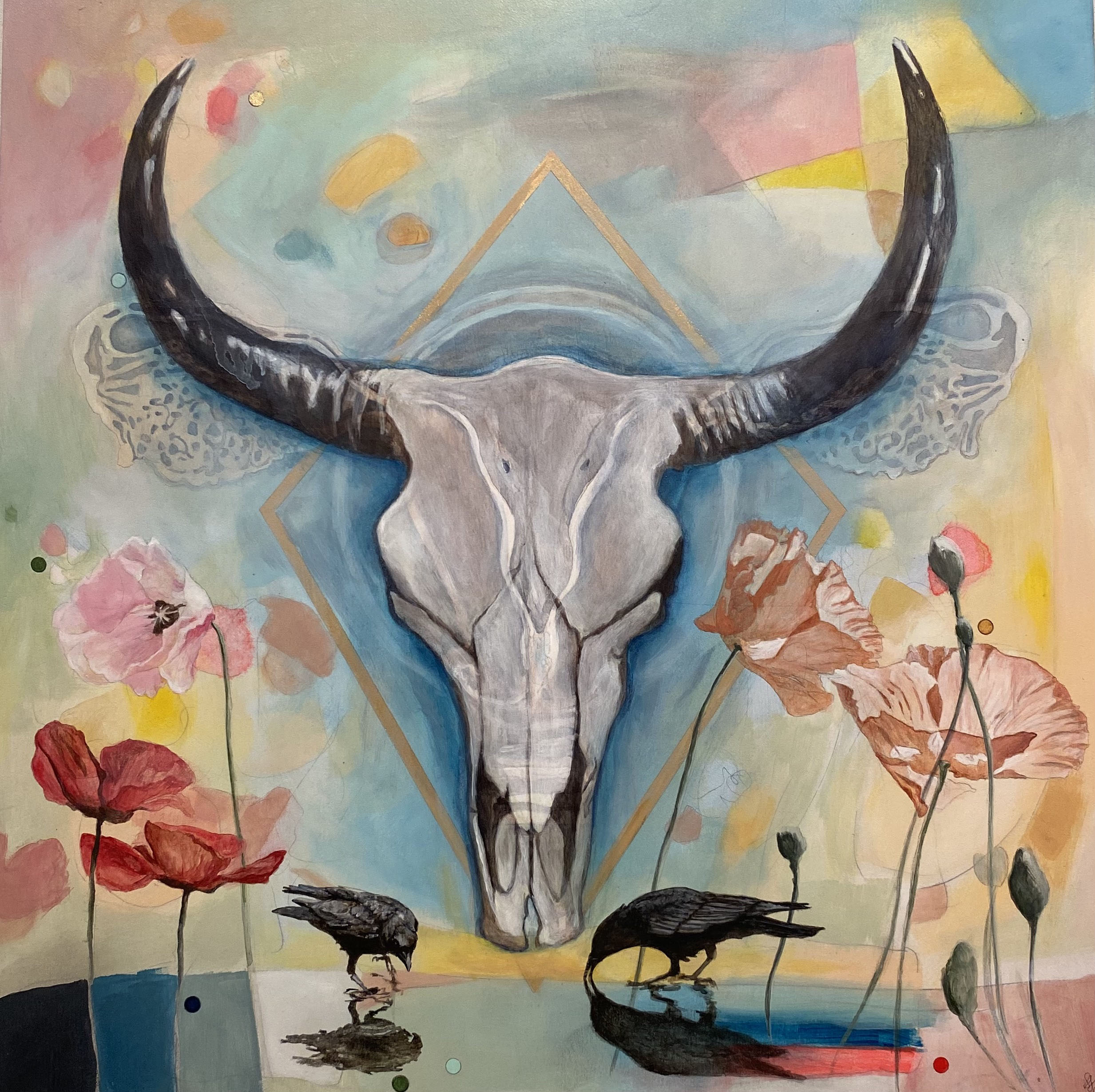 1. Her Flowers Still Bloom, mixed media on wood, 18“x18“