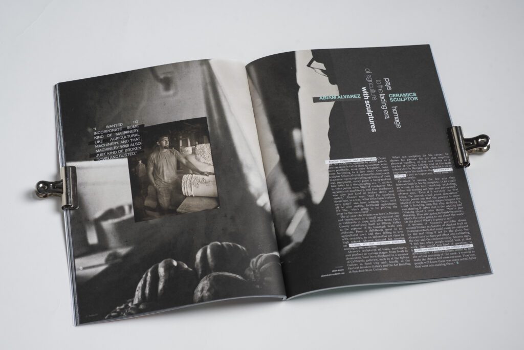 Roman emperor and philosopher Cicero said, “Of all the occupations by which gain is secured, none is better than agriculture, none more profitable, none more delightful, none more becoming to a free man.” Ceramics sculptor Abiam Alvarez echoes this sentiment in a career spent replicating agricultural tools and equipment, every piece a hand-molded love letter to a disappearing era. “I wanted to incorporate some kind of machinery, like agricultural machinery, and that machinery was also just kind of broken down and rusted,” Alvarez says. “And I’m speaking about how, in a way, ‘what if the farm workers were gone?’ and how, without them, we’d all be also rusting, [without] agriculture. It’s like, ‘who’s going to be picking the crop for the consumer?’. ”